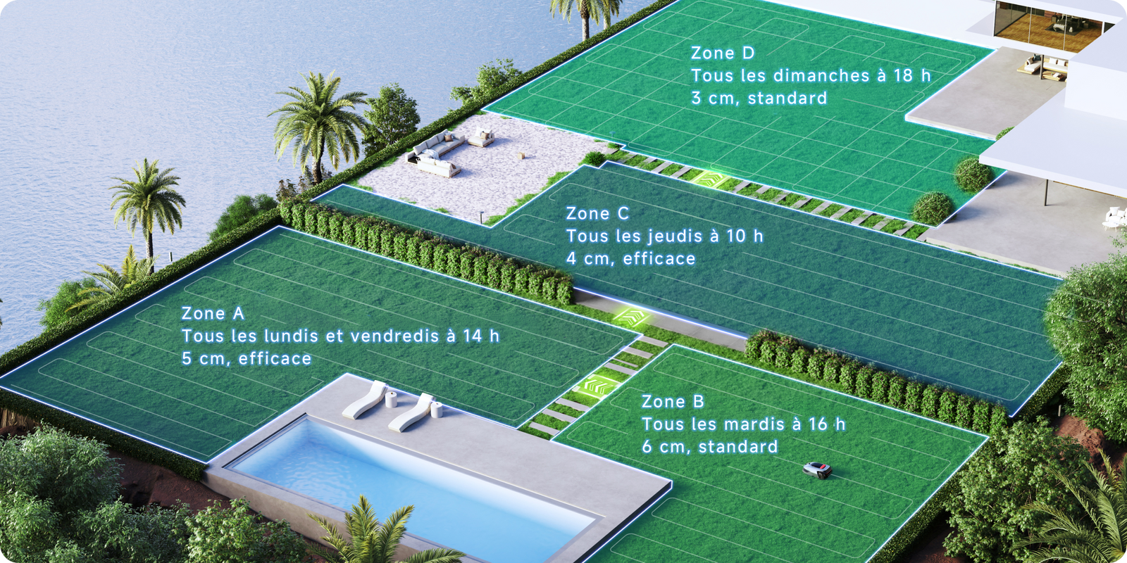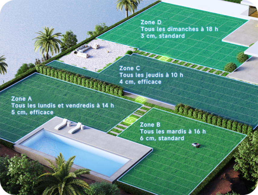 *Une programmation initiale est générée automatiquement une fois la carte créée. Vous pouvez ensuite facilement personnaliser et modifier le plan en fonction de vos préférences. La fonction de double programmation s'applique uniquement aux modes de tonte "toutes zones" / "zone".
