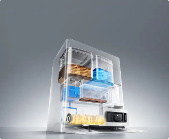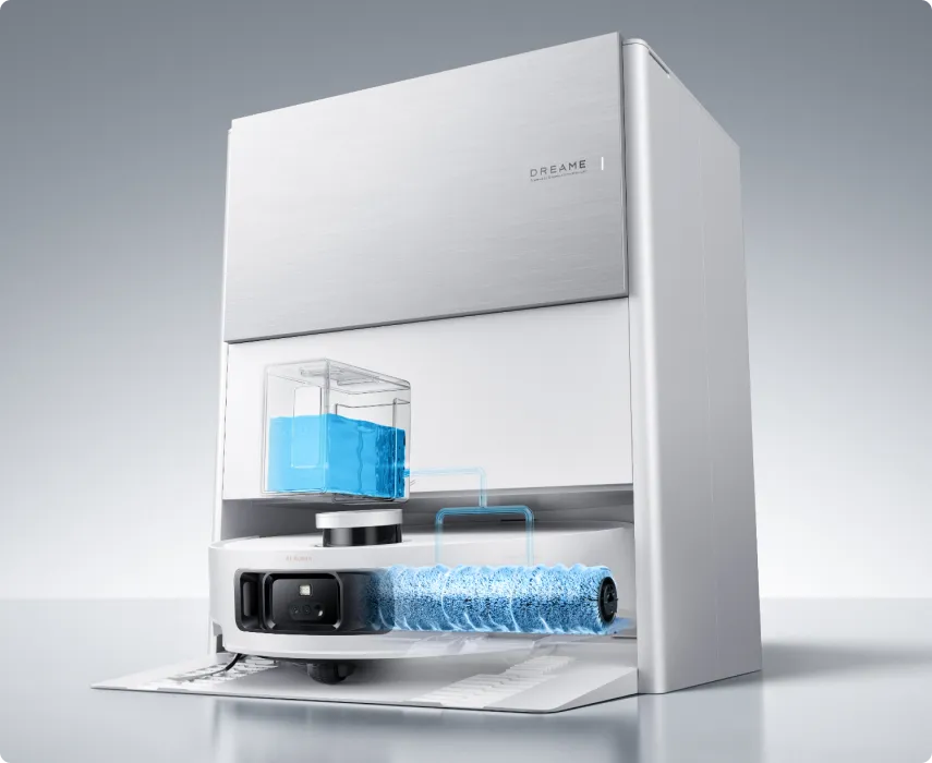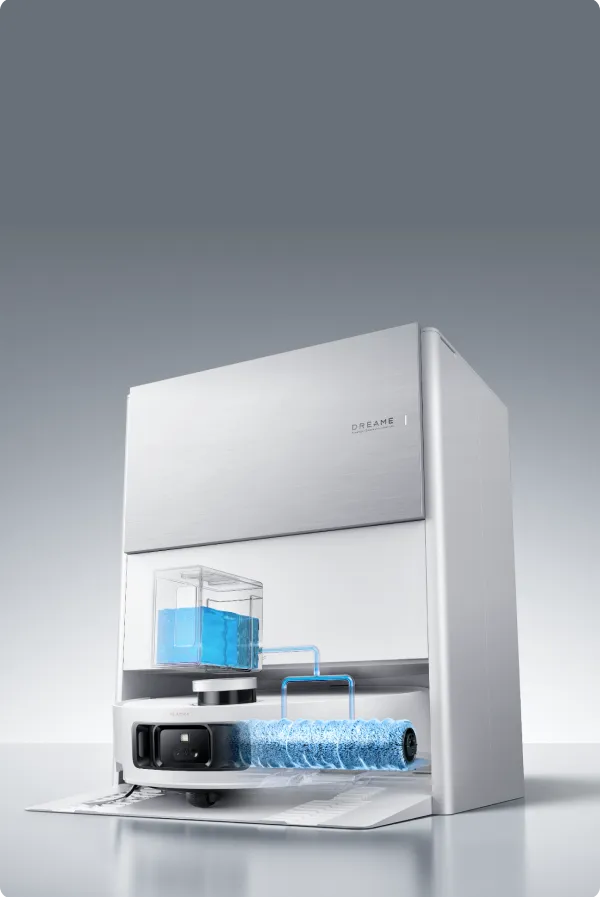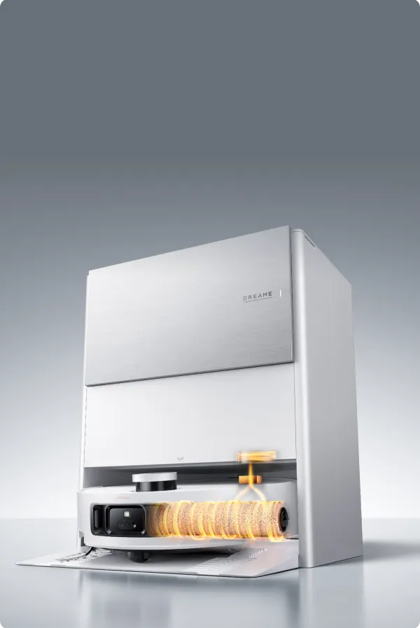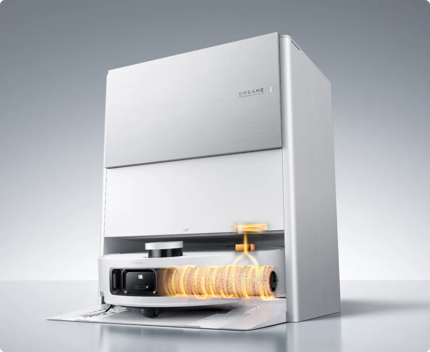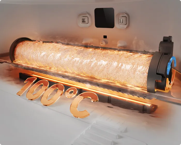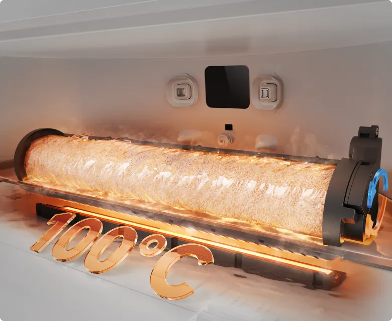 Le robot se donne un « bain chaud » après le nettoyage grâce à sa technologie de nettoyage automatique du rouleau ThermoHub™ à 100 °C*, qui pivote vers l’avant et vers l’arrière dans la base, éliminant les taches tenaces et neutralisant les odeurs de la serpillière à rouleau.