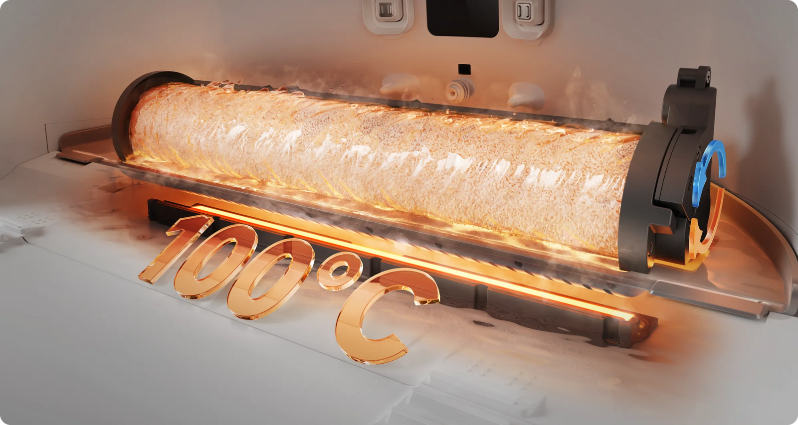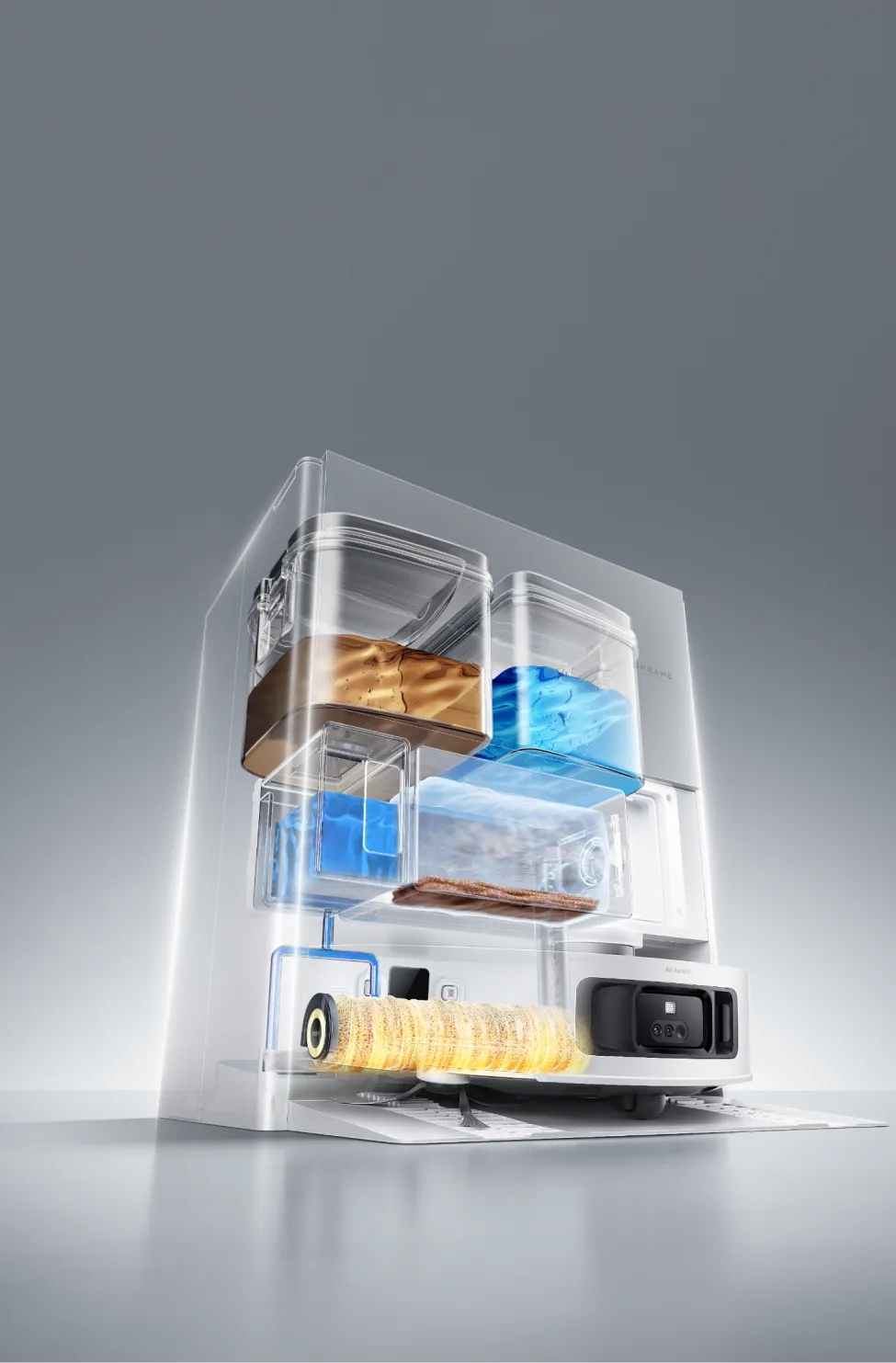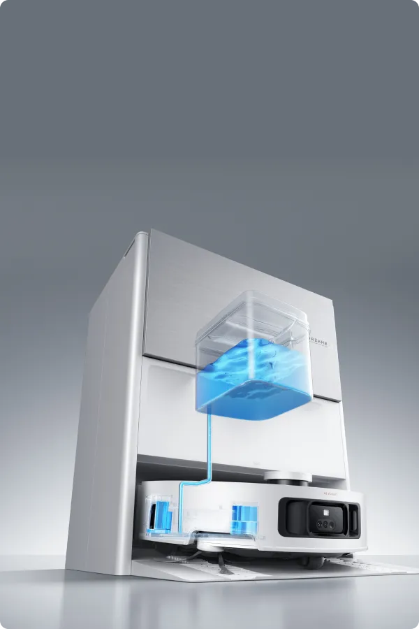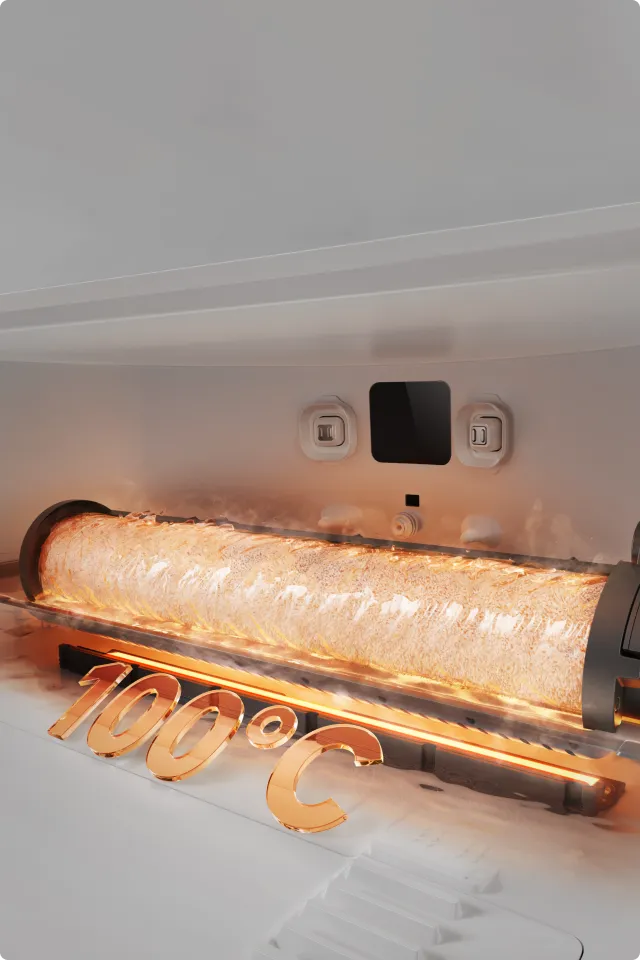 Le robot se donne un « bain chaud » après le nettoyage grâce à sa technologie de nettoyage automatique du rouleau ThermoHub™ à 100 °C*, qui pivote vers l’avant et vers l’arrière dans la base, éliminant les taches tenaces et neutralisant les odeurs de la serpillière à rouleau.