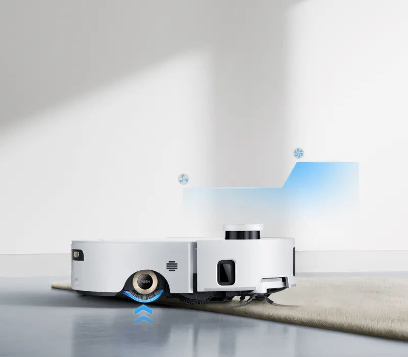 La serpillière du robot aspirateur est soulevée pour passer rapidement sur les tapis et nettoyer d’autres zones et pièces via le mode de franchissement de tapis.
