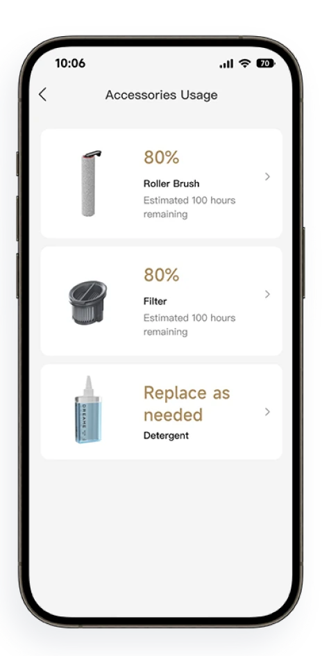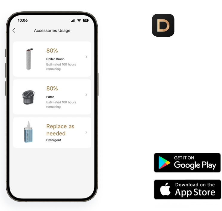 * Un seul remplissage, un mois de nettoyage : 120 ml de solution nettoyante permettent de nettoyer pendant 30 jours (rapport 1:200), d'après les données de tests réalisés en laboratoire par Dreame. L'utilisation réelle peut varier.