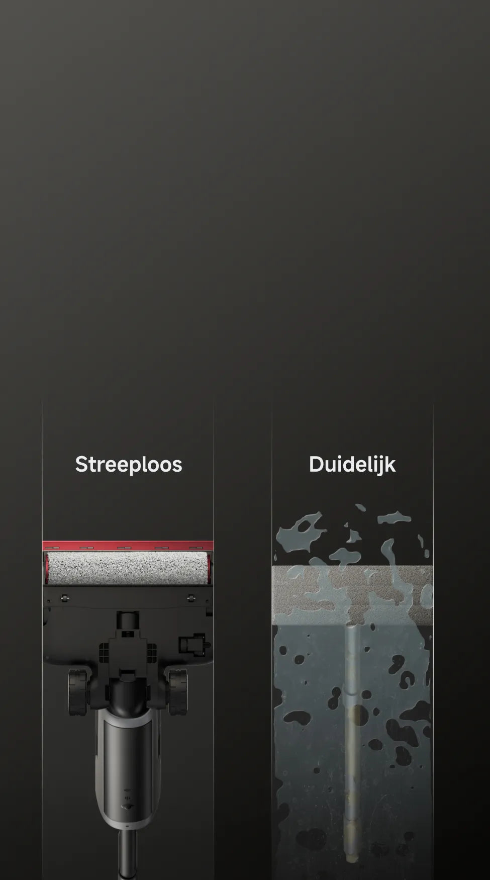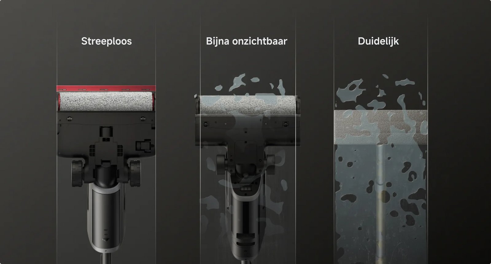 Zodra u de borstel naar achteren trekt, maakt de robotarm stevig contact met de vloer, waardoor bijna geen vlekken* op de vloer achterblijven en weinig schade aan muren ontstaat.
