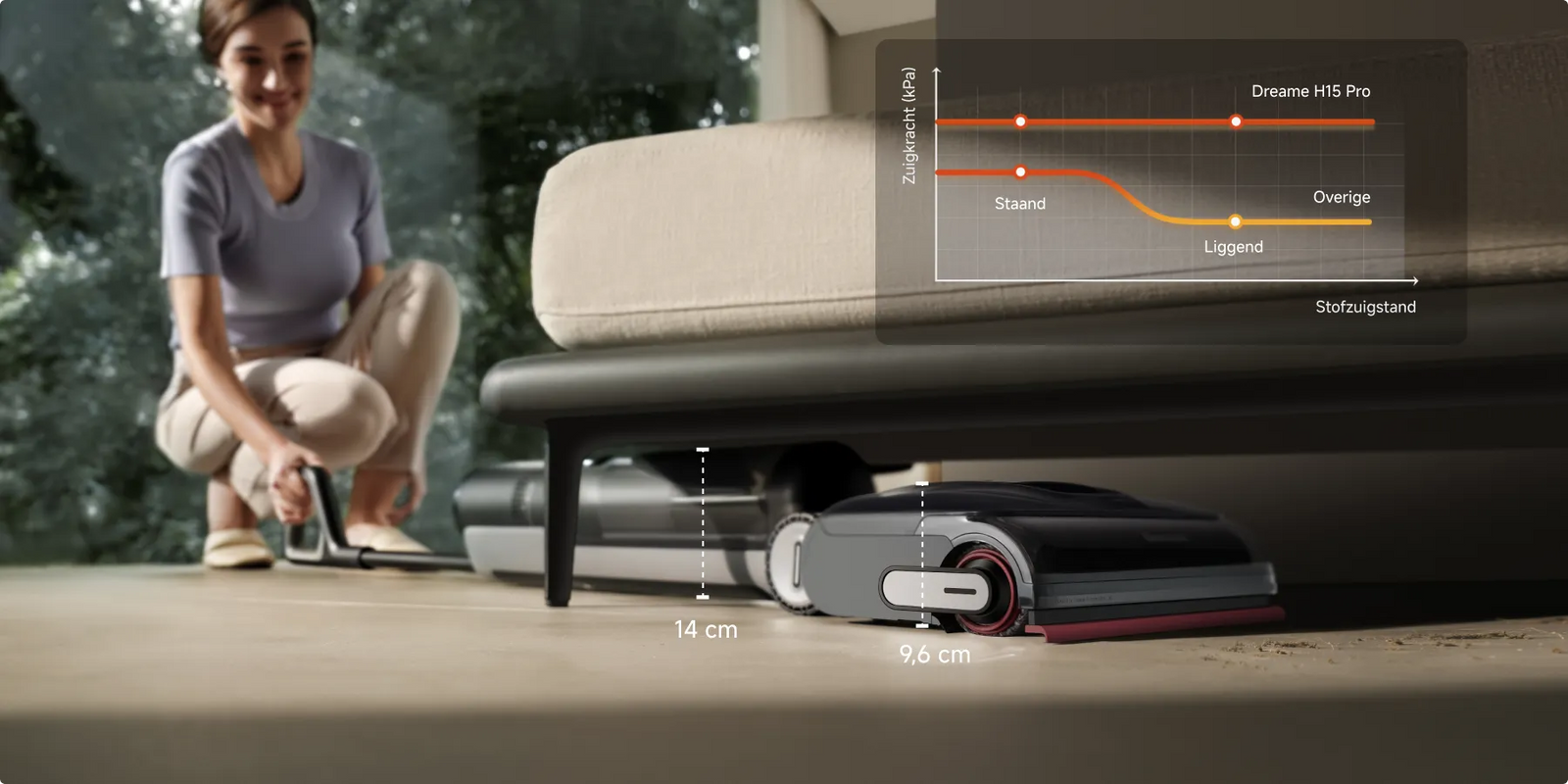 *180°, 14 cm, 9,6 cm: De hele behuizing van de stofzuiger past in ruimtes van slechts 14 cm hoog en de borstelkop bereikt ruimtes van slechts 9,6 cm.