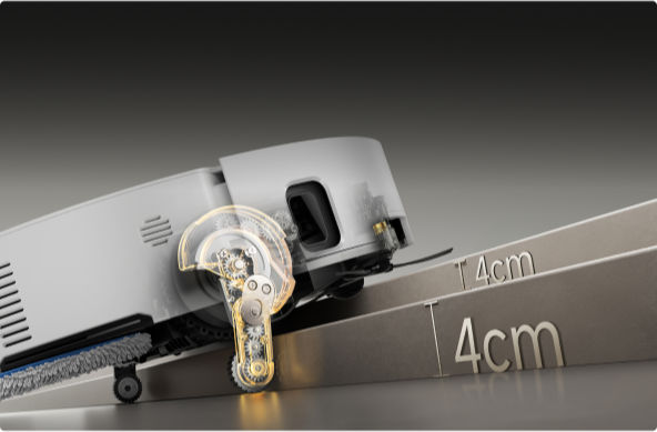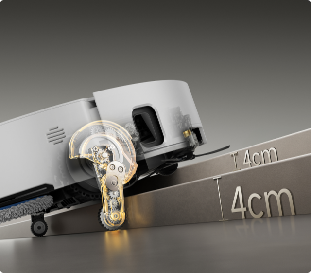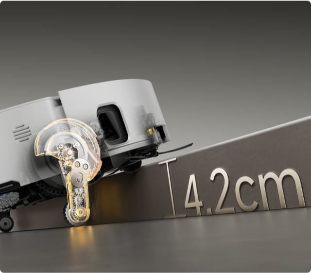 * 8 cm, 4 cm : correspond à la hauteur d'une marche à deux niveaux où la surface supérieure de la marche du bas fait plus de 12 cm de large, lorsque le robot aspirateur utilise ses pieds rétractables en mode Franchissement d'obstacles de type haie. Pour une marche à un seul niveau, la hauteur la plus élevée est de 4,2 cm. Sur la base des données de notre laboratoire interne. Les performances réelles peuvent varier.
