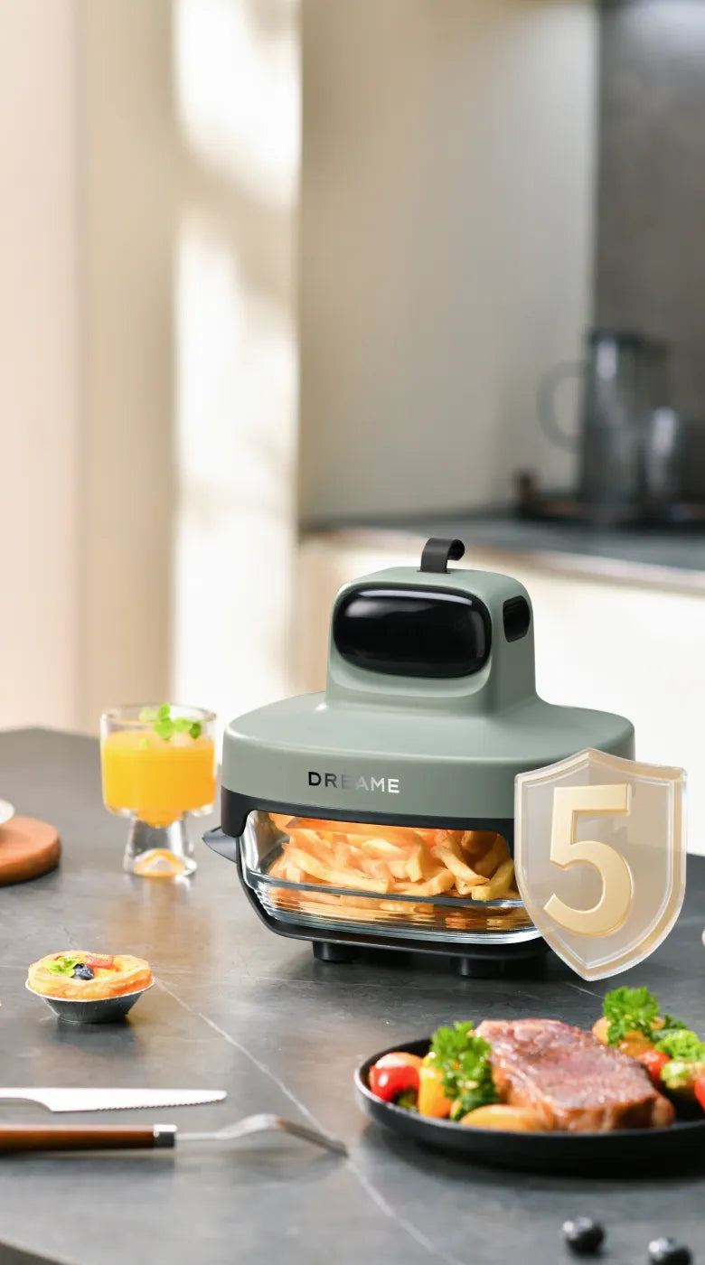 - 5 en 1 fait référence aux fonctions RÔTIR, GRILLER,FRITURE SANS HUILE, MAINTENIR AU CHAUD et RÉCHAUFFER.