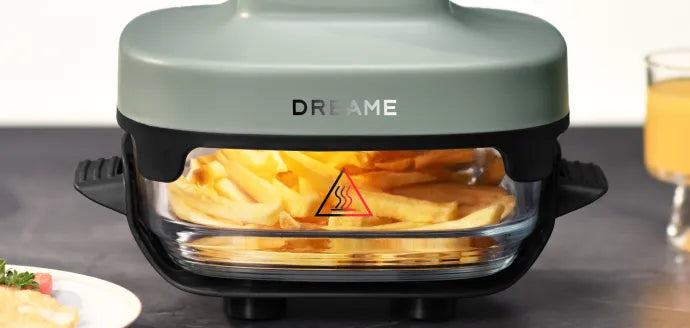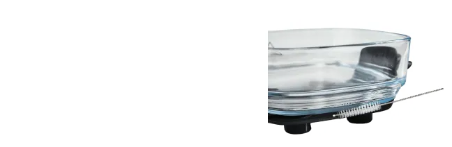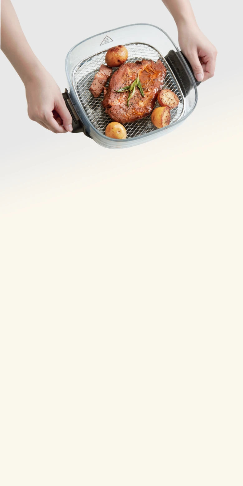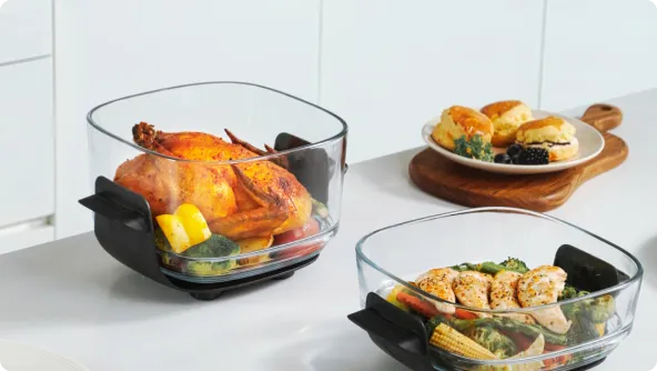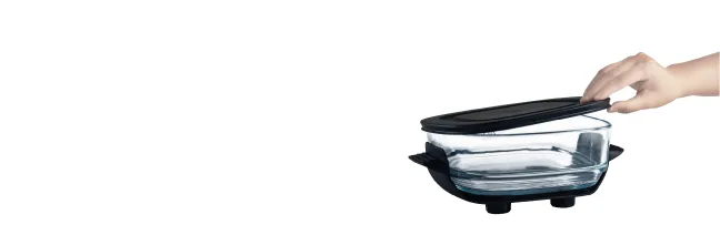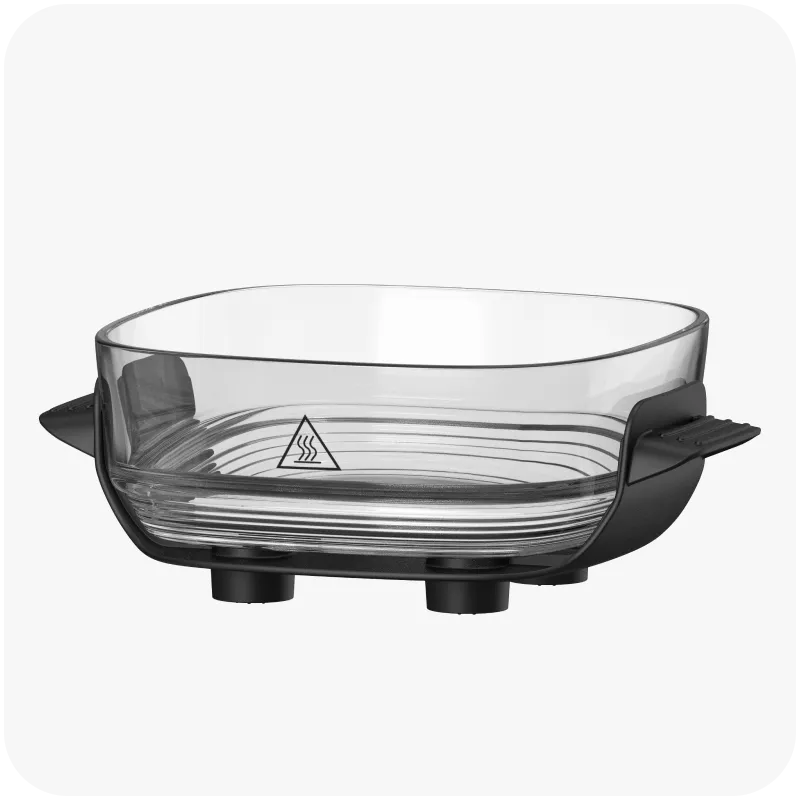 Récipient en verre à haute teneur en borosilicate de 6 mm d’épaisseur* associé à un plateau croustillant en acier inoxydable.