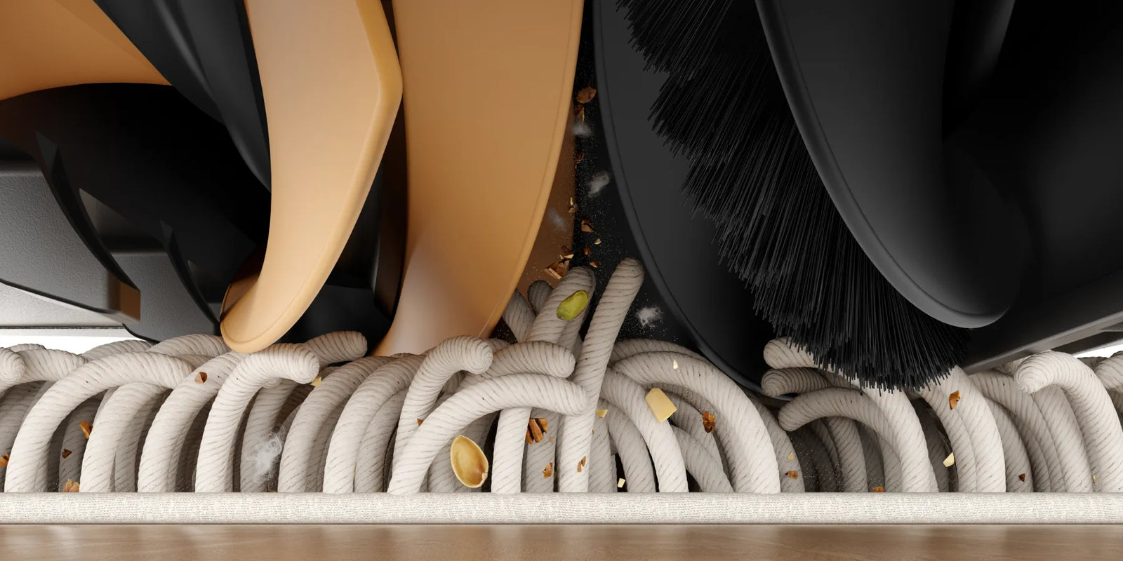 Lors de l'aspiration, la technologie TripleUp Tech abaisse les brosses latérales et principales pour capturer la poussière et les poils d'animaux, tandis que les serpillières s'élèvent à 10,5 mm* pour que les moquettes et tapis restent secs et en bon état. Cette configuration garantit une puissance d'aspiration élevée et protège les tapis et moquettes des dommages causés par l'humidité.