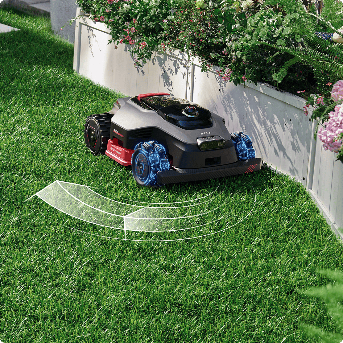 Grâce à la double vision IA et au LiDAR 3D 360°, l’AWD identifie avec une précision accrue les objets fixes et en mouvement sur la pelouse. Il détecte plus de 300 types d’obstacles, même de seulement 2 × 2 cm.