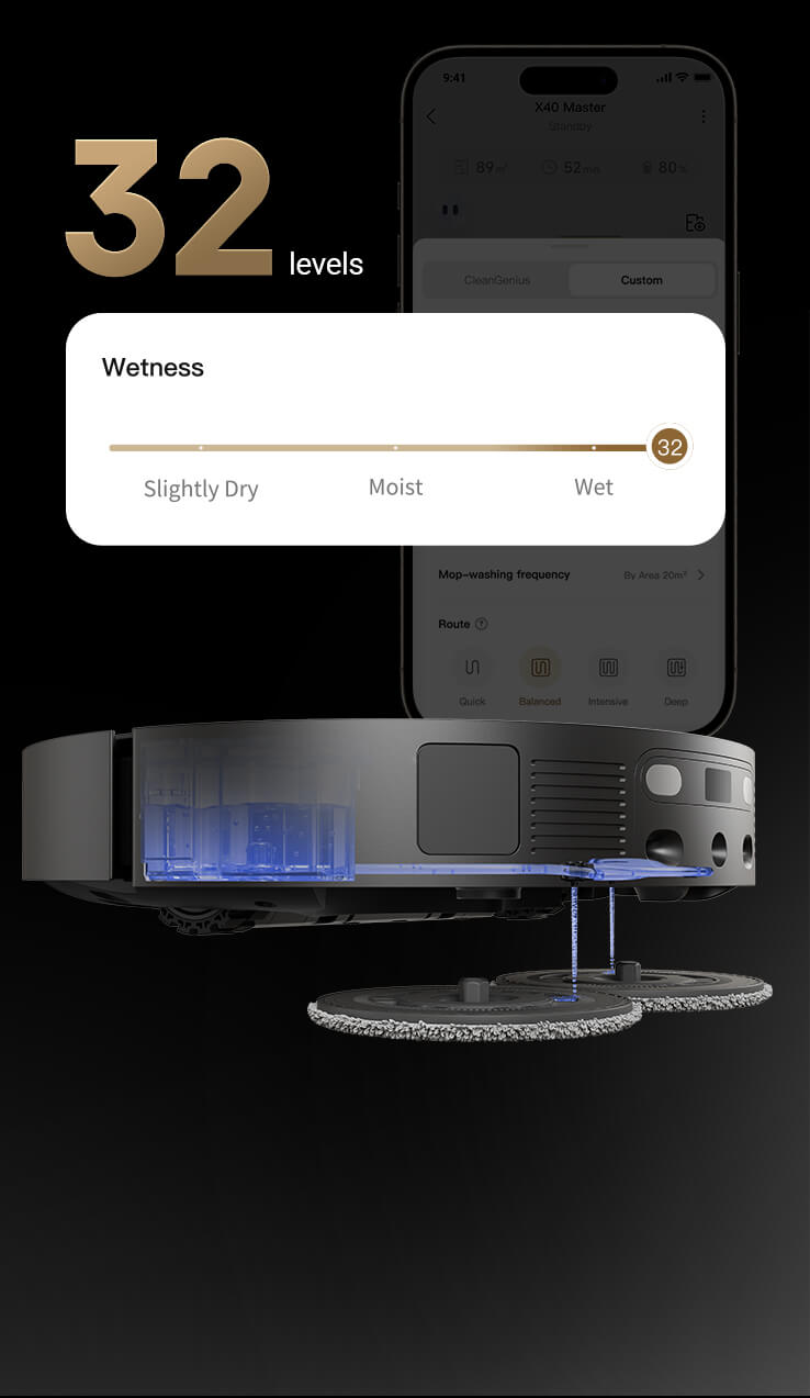 Grâce au levage automatique des serpillières, le X40 Master évite d'humidifier les tapis et moquettes pendant le nettoyage. Cette fonction vous permet de personnaliser votre routine de nettoyage, améliorant ainsi la polyvalence et le confort d'utilisation de votre appareil.