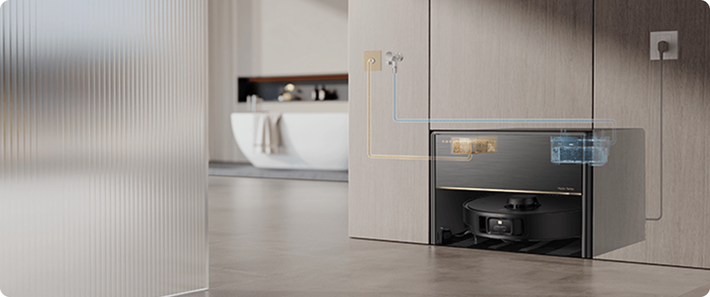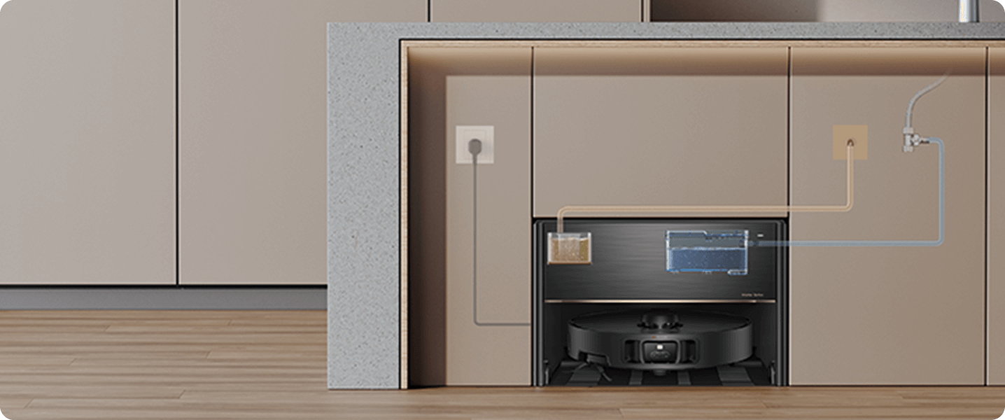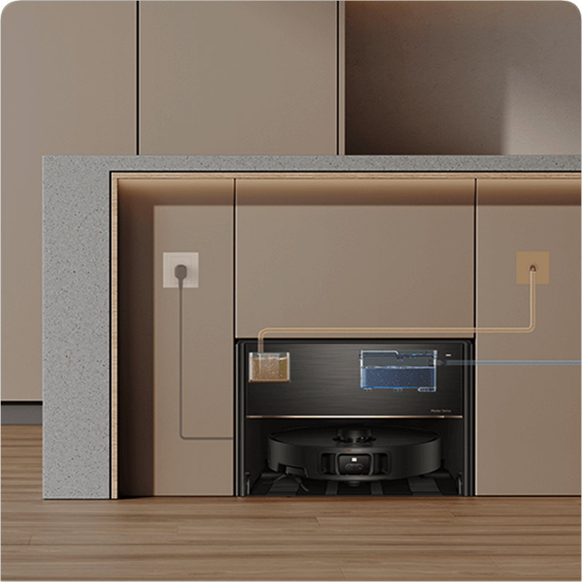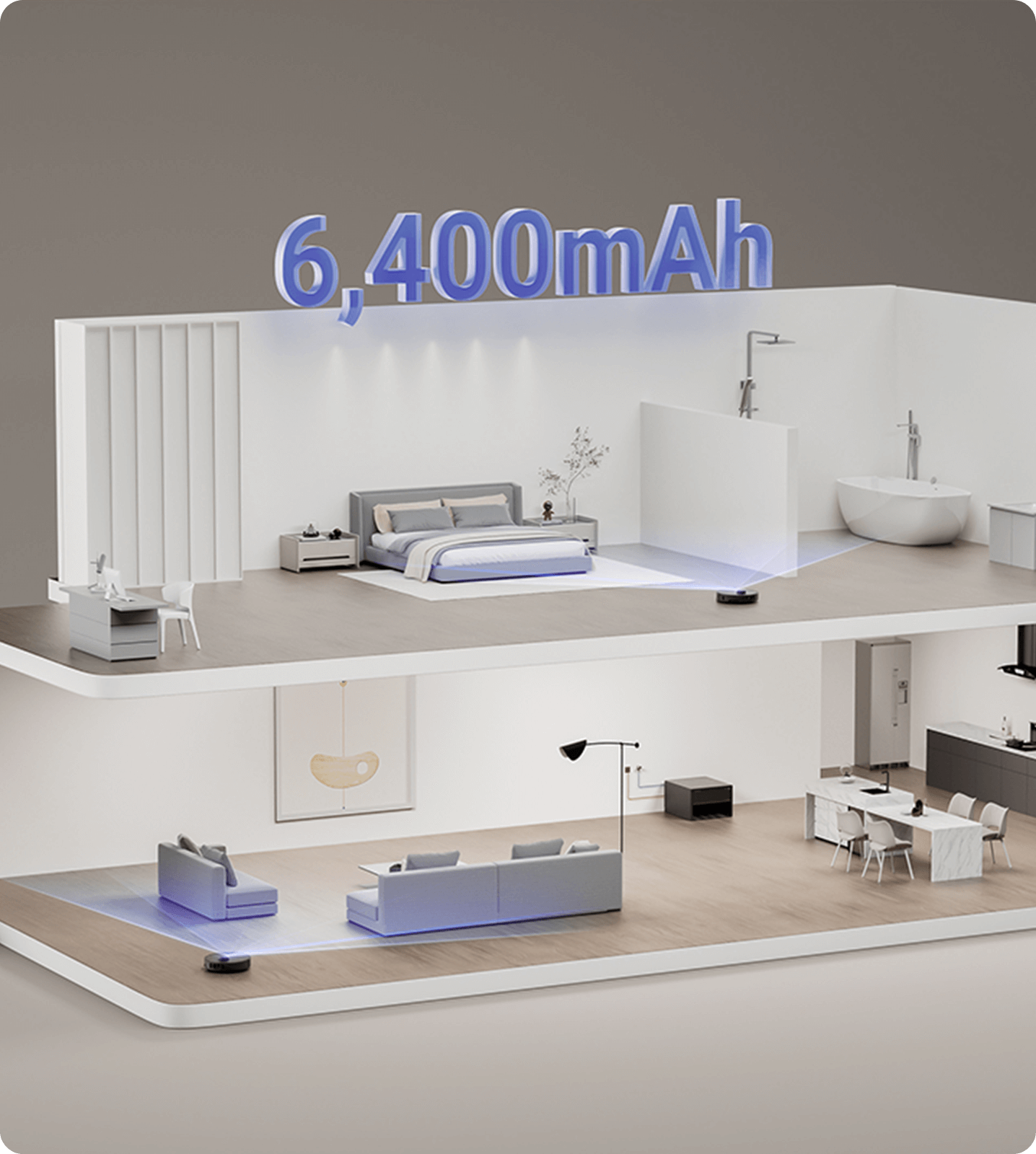 Le X40 Master intègre une batterie puissante de 6 400 mAh , qui permet d'aspirer et de laver les sols pendant 198 minutes* maximum en mode standard, couvrant en une charge une surface pouvant atteindre 308 m²**. Lorsque la batterie devient faible, il revient tout seul sur sa base pour se recharger, puis reprend dès que possible le nettoyage en cours.