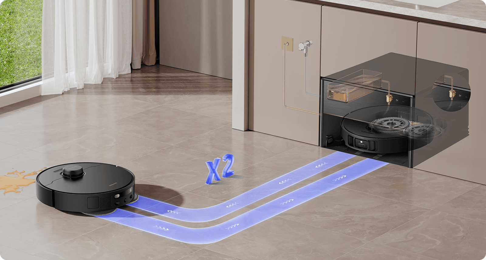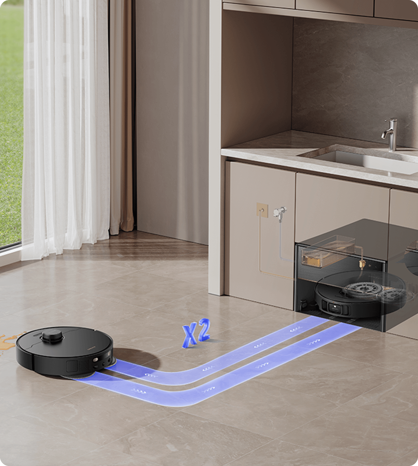 Activez le mode nettoyage intensif des tapis/moquettes* et laissez le robot effectuer un double passage méthodique à vitesse réduite, assurant un nettoyage en profondeur qui préserve la beauté de vos tapis et moquettes.