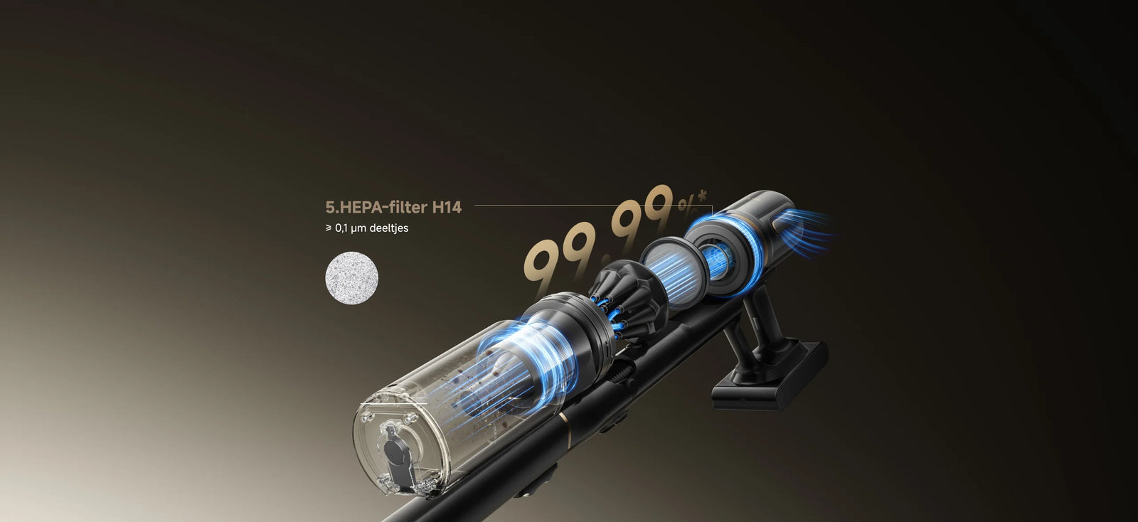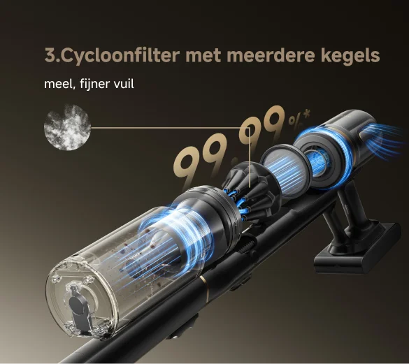 Geavanceerde cycloontechnologie genereert een krachtige centrifugale kracht om stof efficiënt af te scheiden en verstopping van het filter te voorkomen. Zo wordt van begin tot eind een consistente, vlekkeloze zuigkracht gegarandeerd.