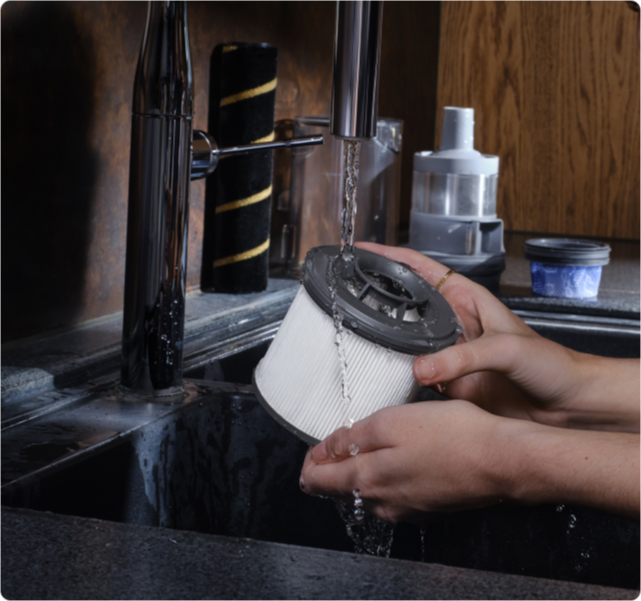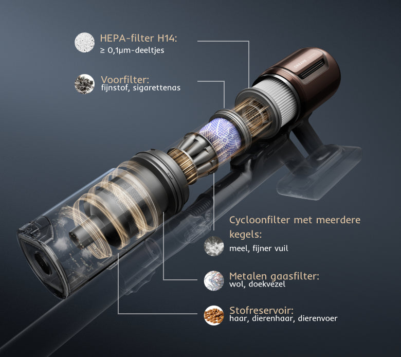 Het vijflaagse filtratiesysteem met een H14-kwaliteit HEPA-filter* vangt fijnstof en deeltjes (inclusief Stuifmeel en huidschilfers van huisdieren) op met een efficiëntie tot 99,99%*. Het helpt om de lucht in uw huis schoner te maken.