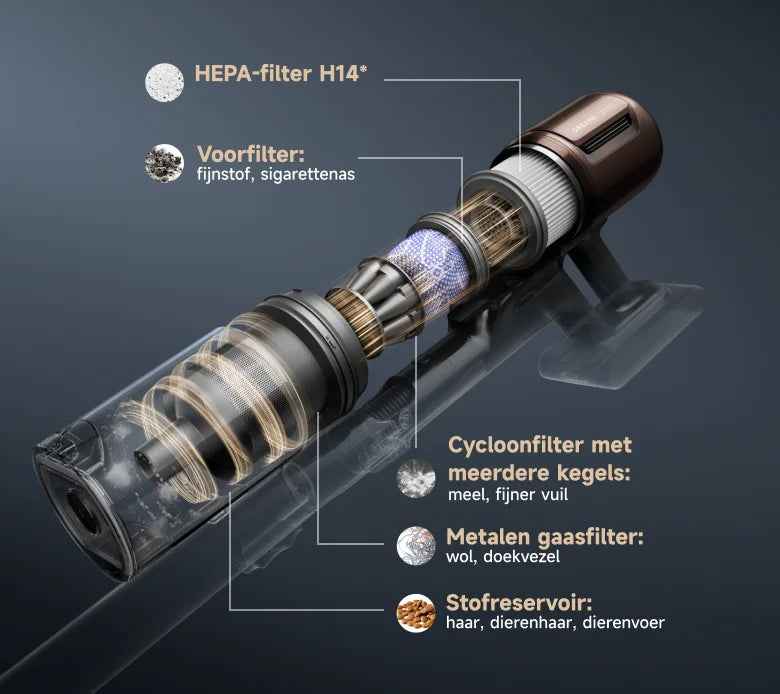 *HEPA-filter H14: Het filtermedium voldoet aan de H14 HEPA-norm in overeenstemming met EN 1822-1:2019, EN ISO 29463-3:2018, gebaseerd op tests uit Suzhou GTT Service Co.,Ltd, rapportnummer 0340-24A-01.