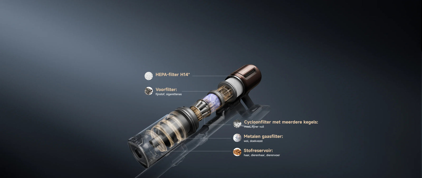 Het vijflaagse filtersysteem vangt fijnstof en deeltjes (waaronder pollen en huidschilfers van huisdieren) op met een efficiëntie tot 99,99%*. Het helpt schonere lucht terug in uw huis te brengen.