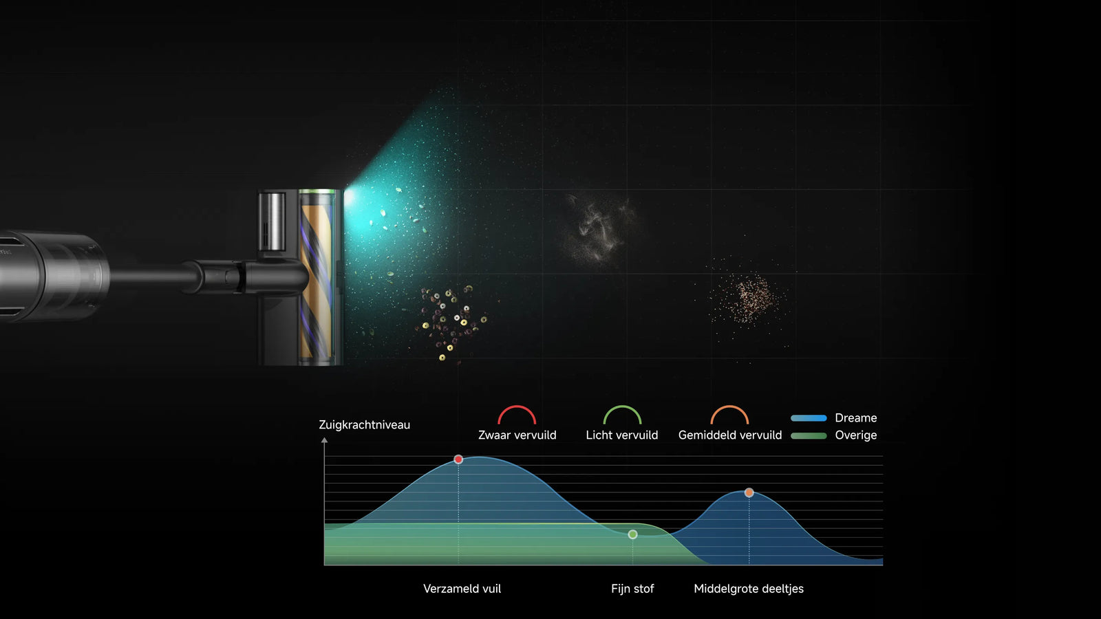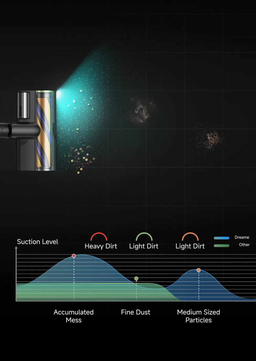 *310 AW/28Kpa, 150.000 tpm: Op basis van onze interne labgegevens. De werkelijke prestaties kunnen variëren. De zuigkracht van 310 AW vertegenwoordigt vanaf mei 2024 de hoogste waarde binnen de Dreame-productlijn van snoerloze steelstofzuigers.