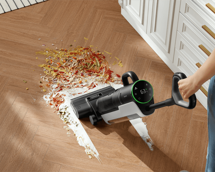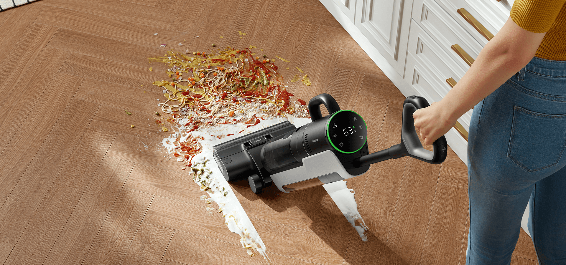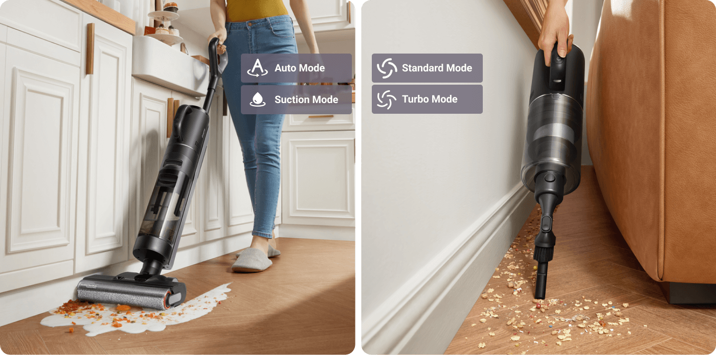 De automodus detecteert en past zich aan het type vuil aan voor een grondigere reiniging. Met de zuigmodus worden gemorste vloeistoffen opgezogen.