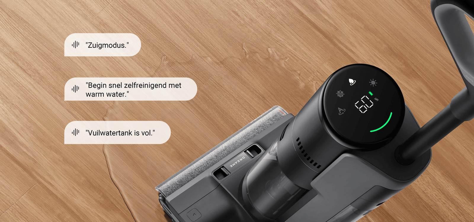 Zie in één oogopslag het resterende batterijvermogen, hoe schoon de vloer is en de status van de stofzuiger. Een groot LED-display en intelligente gesproken meldingen laten u weten hoe u uw reiniging in real-time kunt optimaliseren.
