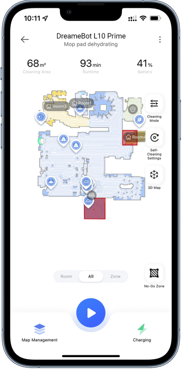 Na elke schoonmaakbeurt worden de dweilen gereinigd en gedroogd. De L10 Prime keert tijdens het reinigen automatisch terug naar het basisstation om de dweilen te wassen en tegen noppen in de verwijderbare bodemplaat te schrobben voordat deze aan de volgende reinigingsbeurt begint. Wanneer het reinigen is voltooid, worden de dweilen opnieuw gewassen in het basisstation en worden de dweilen droog geblazen.