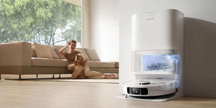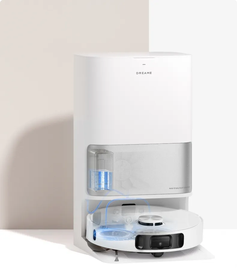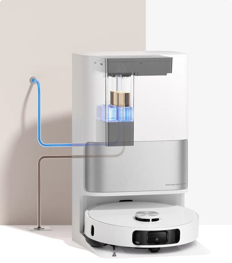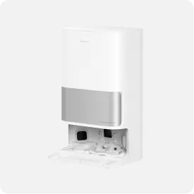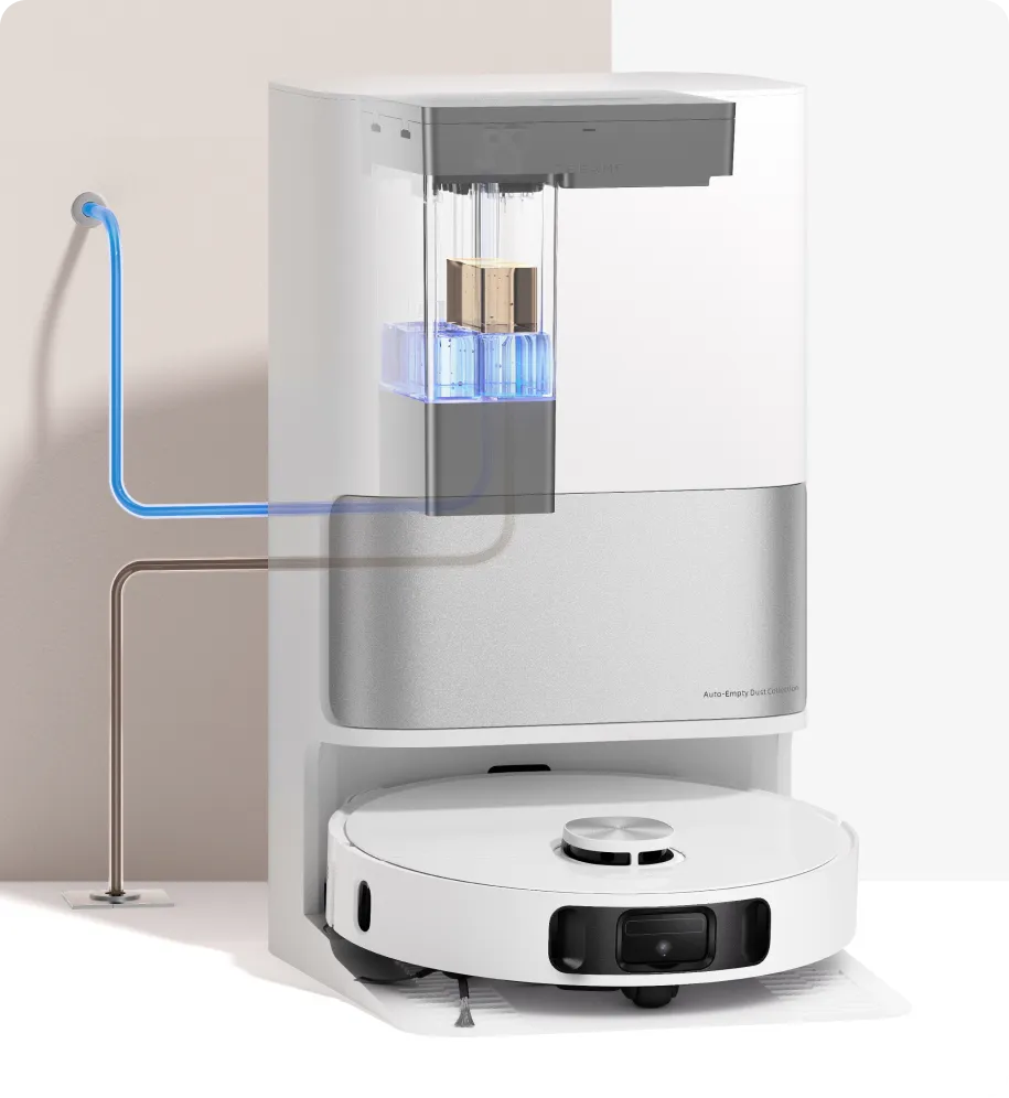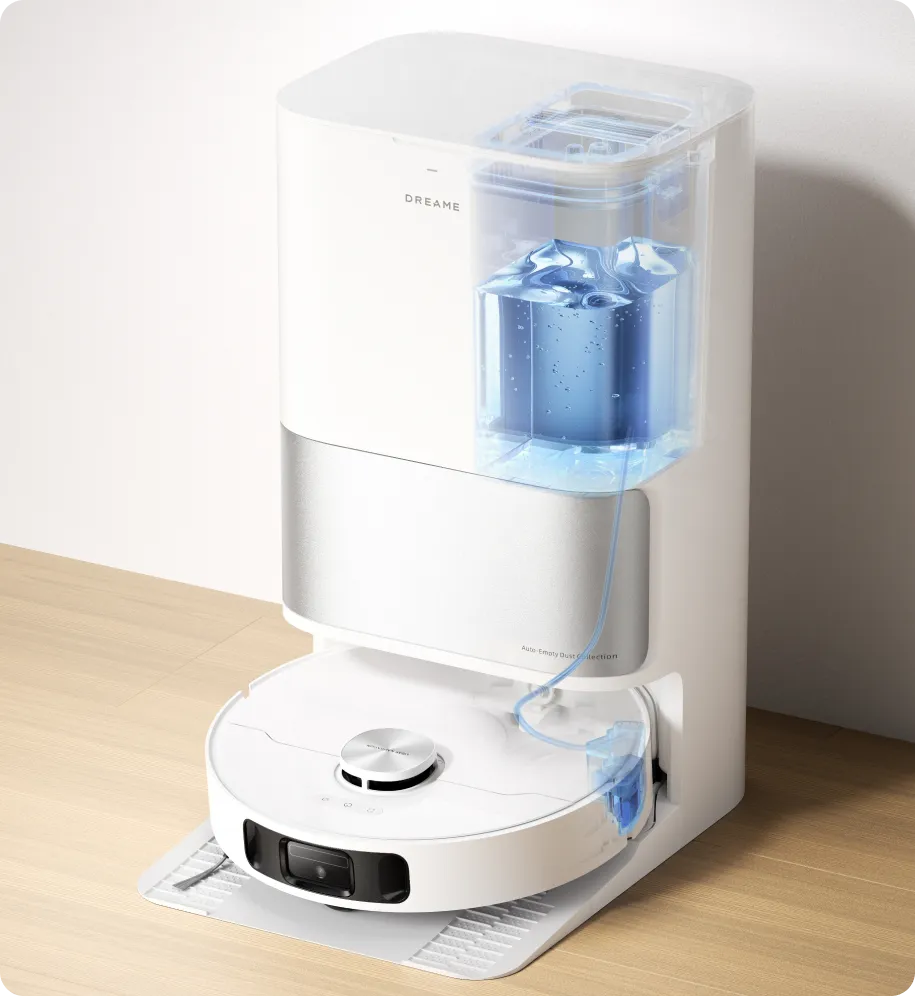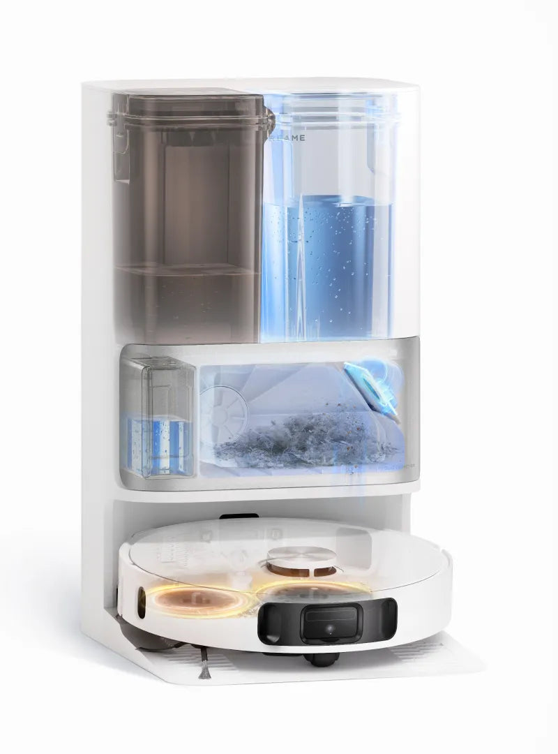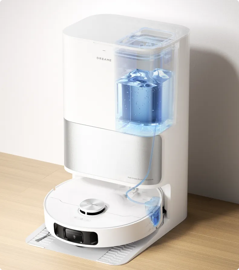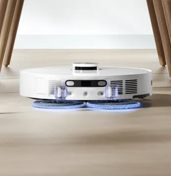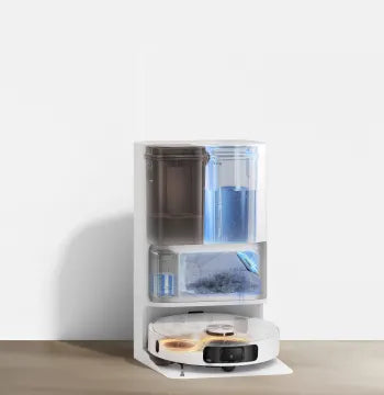 De slimme stofzuiger met een schoonwatertank van 4,5 liter vult zelfstandig water bij om de dweil continu nat te houden.
